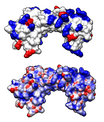 We'll look at the electrostatic potential of a DNA binding protein 1qna. The DNA phosphate backbone is negatively charged. Interaction with positive charge on a protein can contribute to binding.