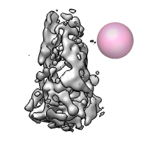 Open the HIV virus particle map hiv.mrc and start the volume eraser tool from the volume dialog Tools menu. A transparent pink ball will be shown that can be moved around with the middle mouse button. Holding the shift key allows moving the ball into and out of the screen. Pressing the Erase button erases the volume data values within the sphere. A new copy of the partially erased volume data is made and it can be saved to a separate file.