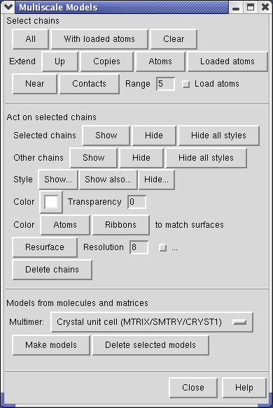 The Multiscale dialog is divided into 3 sections by horizontal lines. The top section has buttons for selecting parts of the multimeric atomic model. The middle section is acting on the selection (hiding, showing, coloring, changing display styles). The bottom section is for creating multimeric models.