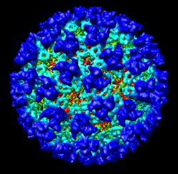 This 9 angstrom resolution density map is a single particle reconstruction from electron cryo-microscopy. The virus surface consists of glycoproteins embedded in a lipid envelope. Inside that layer is a protein shell of 240 copies of the nucleocapsid protein, and inside that is packed the single-stranded viral RNA genome. The lipid and viral RNA are not arranged with icosahedral symmetry and are not visible in this density map. This density map emd_1015.map and others are available from the EM database.