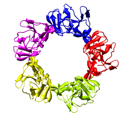 You will notice that rotation is still happening about the center of the virus particle. That is inconvenient now. Use Tools / Viewing Parameters / Rotation and set the center of rotation method back to center of models. Now mouse rotations will occur about the center of the 5 protein ring being displayed.