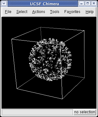 Adjusting the virus map threshold level to approximately 8000 in the Volume Viewer dialog shows the nucleocapsid proteins as red blobs. To adjust the virus map select emd_1015.map using the the Data menu on the second line of the Volume Viewer dialog. That menu allows you to switch between the virus map and radius map that you have opened so far.