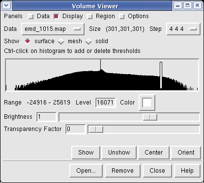 Near the top of the dialog the data size, 301 by 301 by 301, is shown. The Step menu allows you to subsample the data. For this large map, the initial step is 4 4 4 which means to use every fourth density value along each of the 3 axes. The 1 1 1 step setting shows full resolution data -- but don't try that highest resolution setting now because it will be very slow to compute the surface and render it (~1 minute). Later when we restrict the display to a smaller piece of the map we will use higher resolution.