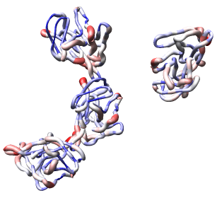 In the Render by Attribute dialog choose Attributes of residues and below that choose Attribute average b-factor, then press Apply at the bottom of the dialog. Now the ribbons are colored blue to indicate high density and red to indicate low density. Click on the Worms tab near the bottom of the Render by Attribute dialog and press Apply again to make the thickness of the ribbon also correspond to the density. Fat areas are low density indicating regions where the atomic model does not lie in high density regions of the density map.