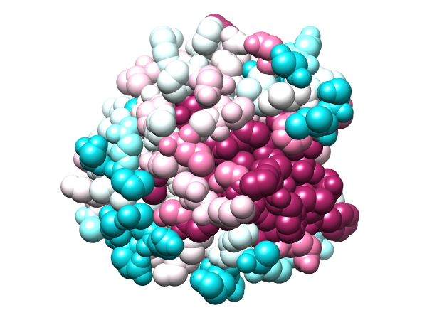 (result of submitting 1hd2 to the ConSurf server and choosing to show results in Chimera; alignment has 150 sequences including that of the query, 1hd2)Given a protein structure, the ConSurf server estimates the evolutionary conservation of amino acid positions based on the phylogenetic relations between homologous sequences (details...). It also works on nucleic acids.