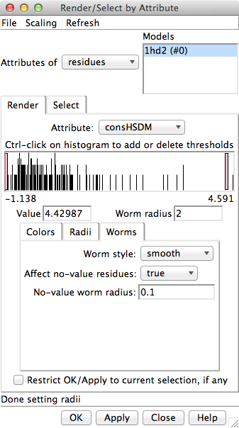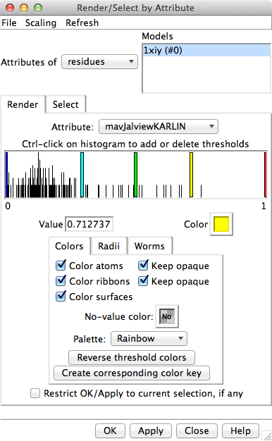 - Again from the Multalign Viewer menu, choose: Structure... Render by Conservation. This will call Render by Attribute, in which you can interactively choose colors and how they should map to the values. The conservation values from Multalign Viewer will be the residue attribute named mavConservation. Try different colorings. If you go back to the previous step and change the calculation method, then choose Refresh... Values in the Render by Attribute menu to update its histogram with the new values before coloring again. When you get the coloring you like, you can turn on the option to create a color key for your figure. You could also use “worms” (special ribbons that vary in fatness) in addition to or instead of colors to show the conservation values [colors+worms image]. Another way to color by attribute value is with a command, for example: