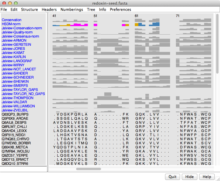 - used a hideous process (due to my limited programming skills... I'm sure you could come up with something much more elegant) as described in the comments of my fortran program jalview2hdr.f, involving minor manual editing and some string subsitution with a sedfil before running the program. I did this mainly as an academic exercise. In general, I don't see an advantage of the Jalview-AACon measures over those currently available for less effort via Chimera-AL2CO. Findings (July 2014): the AACon service rejects alignments with >5000 sequences or >1000 columns and will fail silently if there are symbols other than for the standard 20 amino acids (e.g., ambiguity codes B, Z, X, or codes for rare amino acids U, O).