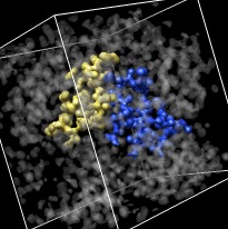 The example shows a unit cell of x-ray density for PDB model 1a0m. Two monomers have density not connected to any surrounding density at a contour level of one standard deviation and have been colored yellow and blue with volumes reported as 238 and 240 ų.