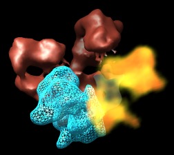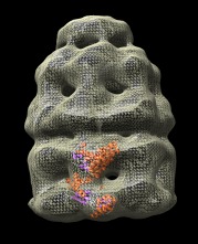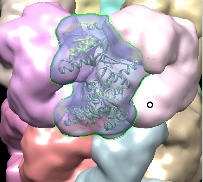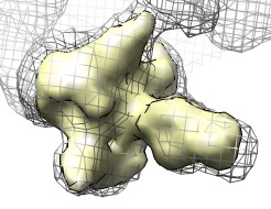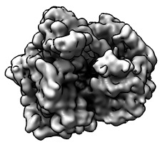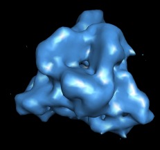 The image shown is a Trypanosoma 80S ribosome (EMDB 1303). Silhouette edges (menu entry Tools / Viewing Controls / Effects) and reduced shininess (menu entry Tools / Viewing Controls / Shininess) have been used to increase the ambient occlusion depth effect.