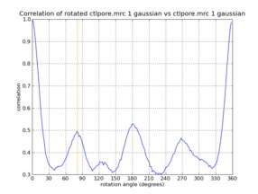 where the map, its copy, and the rotation axis have model id numbers 0, 1 and 2. To create the symmetry axis and a copy of the map refer to the find symmetry axis description. The command creates a plot in a separate window showing correlation coefficient versus rotation angle. Clicking and dragging in the plot window will rotate the map copy to the corresponding angle and show an vertical line at that position in the plot window. The plot image can be saved.