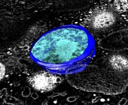 A map of GroEL is shown, sliced perpendicular to the cylinder axis (EM database entry 1080). Red is low density and blue is high density.