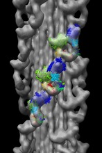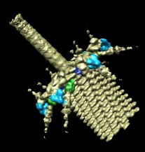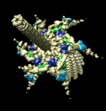 The image shows part of the phage T4 tail assembly. Regions of the EM density map near three structural proteins GP8, GP9, and GP11 are colored blue, green and cyan. (EM database entry 1089, and PDB model 1tja.)