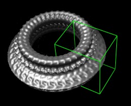 This command copies part of volume #0 within the selected surface projecting along the x axis. The surface object is selected using the left mouse button with the ctrl key held down. The projection axis (default z) effects how holes in the surface are handled. Points within the surface when viewed along the projection axis are taken.