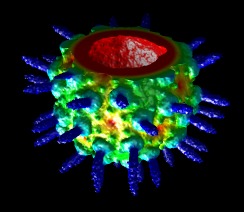 The image shows a fibered phi29 virus particle colored red near the center and blue near the extremities. (EM database entry 1116.)