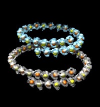 The image shows a machine that regulates fusion of vesicles with membranes, N-ethyl maleimide sensitive factor (NSF). (EM database entry 1059). It has been colored by cylinder radius using the Surface Color tool. Two copies of the data set are shown with step 1 1 1 on the left and step 4 4 4 on the right, and smoothing turned on for both.
