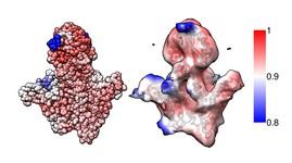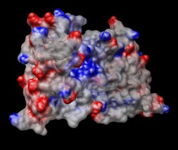 The image shows a solvent excluded molecular surface colored according to electrostatic potential. Blue represents positive potential and red negative. Zero potential is white, partially transparent. Chimera does not compute electrostatic potential, but can display electrostatic potential grid data computed by other programs (eg. DelPhi, APBS, UHBD).