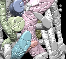 This method was developed for rather well separated objects touching in small places (bacteria in termite gut). It will be very slow for more than 100,000 watershed regions (local maxima) so smoothing the volume data beforehand may be necessary to reduce the number of regions. On Mac OS 10.6 poor system graphics driver memory management makes the region display unusably slow for more than 5000 displayed regions.