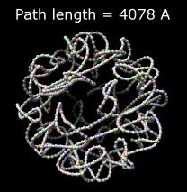 The image shows a model of the 1056 nucleotide single stranded RNA genome of satellite tobacco mosaic virus. The path length was displayed in the image using the Chimera 2D Label utility (menu entry Tools / Utilities / 2D Labels).