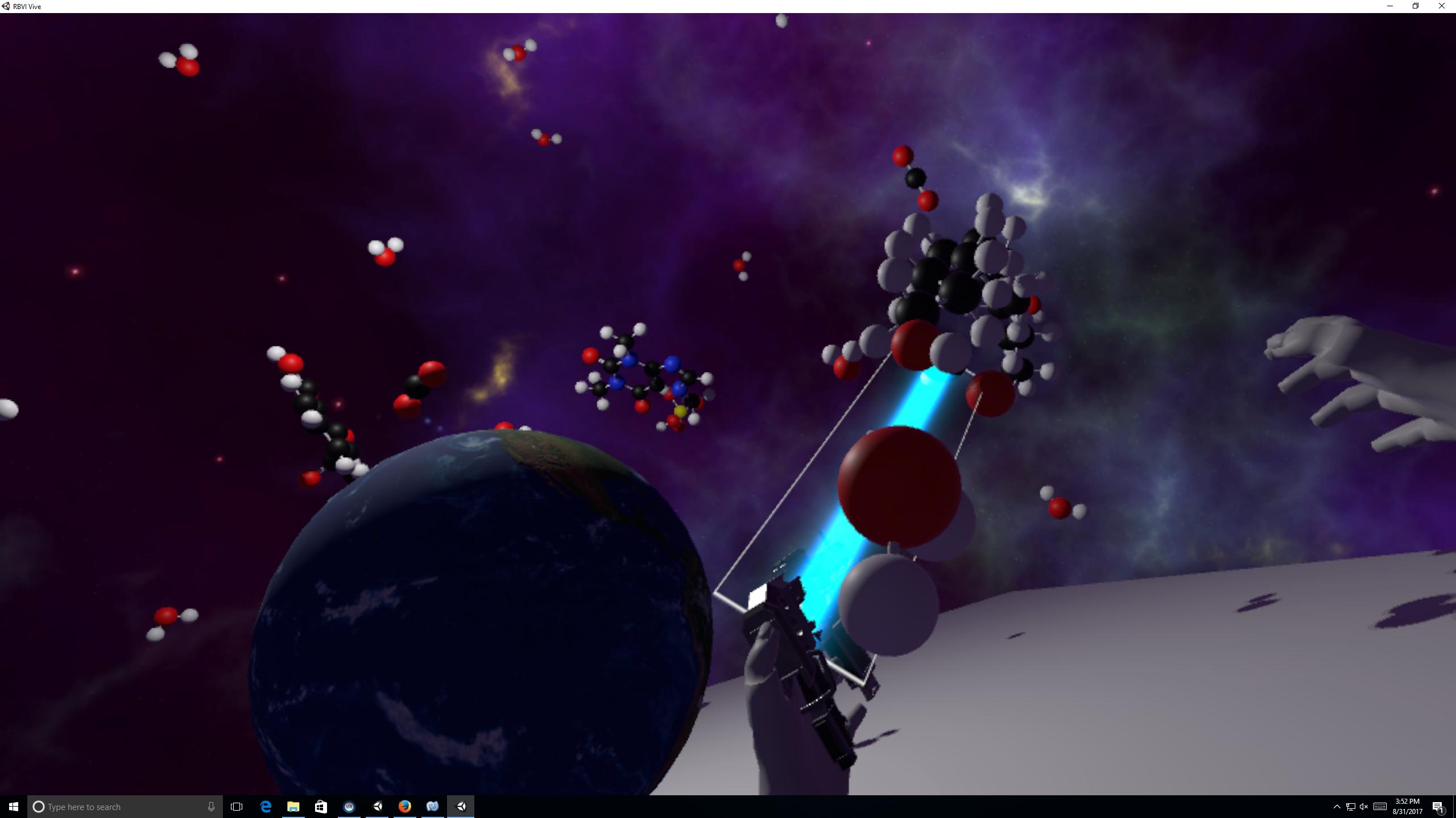 This molecular VR application allows holding flexible small molecules like water, carbon dioxide, aspirin, caffeine, saturated fat, sulfuric acid, breaking them, reassembling them. It does not use ChimeraX, but instead is a standalone application (built with Unity). Extract it from the zip archive molzoo8.zip and run the application and use the hand controllers, index finger to grab, tractor beam or shoot molecules, and thumb pad to switch modes. Source code and possibly newer releases are available at Github Molecular_Playground.
