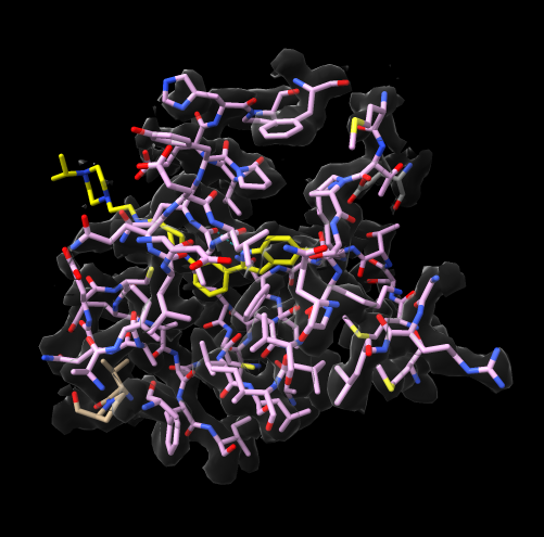 This shows a drug that is an inhibitor of the p97 molecular machine (AAA+ ATPase) involved in protein degradation. Single amino acid mutations of the p97 machine cause neuro-degenerative disease. The scene shows just the drug and the parts of p97 immediately adjacent the drug, including the electron microscope imaging seen as a transparent surface. The p97 atomic model is Protein Data Bank entry 5ftj