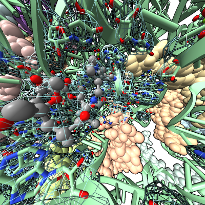 This scene immerses you in an E. coli bacterium ribosome, the giant molecular machine that translates DNA and RNA into proteins in all living things. This scene has an antibiotic telithromycin, consisting of about 40 atoms shown in purple at the center of the ribosome. In the scene, ribbons show RNA, spheres show protein components of the ribosome, and the transparent surface near the ligand shows the experimental X-ray data used to determine this structure. More details.