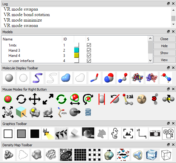 Show VR user interface panel. Press the application button on the hand controller to show the ChimeraX user interface in VR. This button is in different locations on different hand controllers so try all the buttons until you find the right one.