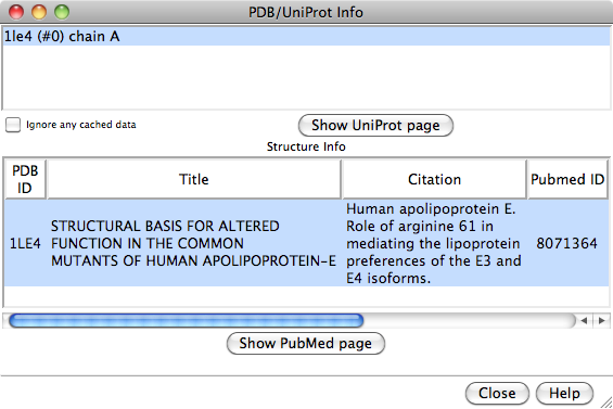 The top part of the initial dialog lists the PDB chains currently open in Chimera. One or more chains can be chosen with the left mouse button. Choosing a chain uses its PDB ID to retrieve structure annotations and any PDB-UniProt mapping information (UniProt ID and residue number correspondences) from the RCSB PDB. The information is fetched as an XML file that can be cached and reused as needed depending on the Fetch preferences and whether the option to Ignore any cached data is checked. A dialog will appear for entering the PDB ID if it cannot be determined automatically. If the chain does not correspond to an entry in the PDB, no information can be retrieved. Sequence annotations are fetched from UniProt; these are not cached.