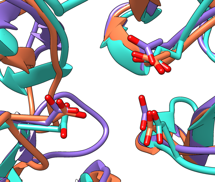 A window size of 750x636 pixels and two positions were used for the example images. A view of the overall structures was generated by interactive manipulation, then saved (with savepos) as a position named overall. Another position zoomed into the active site was generated from overall by scaling and translation only (to maintain a consistent view) and saved as as the position closeup.