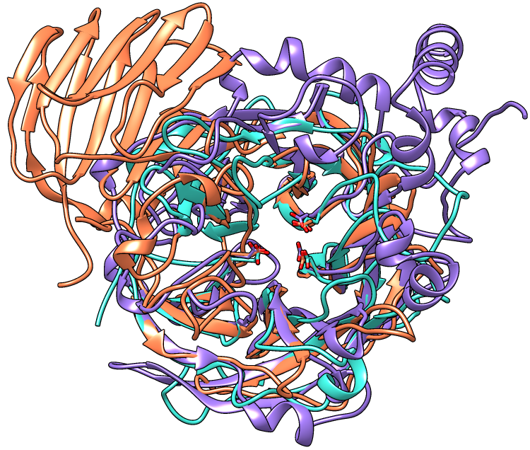 In this case, the light blue structure (model 1, arabinanase) is better superimposed with the others in the result from MatchMaker (position pos1).