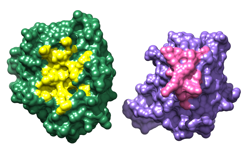 Of course, many other combinations of effects and coloring schemes are possible. Just to name a few, surfaces could be colored to show hydrophobic/hydrophilic compatibility or electrostatic complementarity as in the Surface Properties tutorial, conservation within associated sequence alignments as in the Sequences and Structures tutorial, or concavity/convexity as in the Attributes tutorial, part 2. A color key and text could be added, as in the B-factor Coloring tutorial.