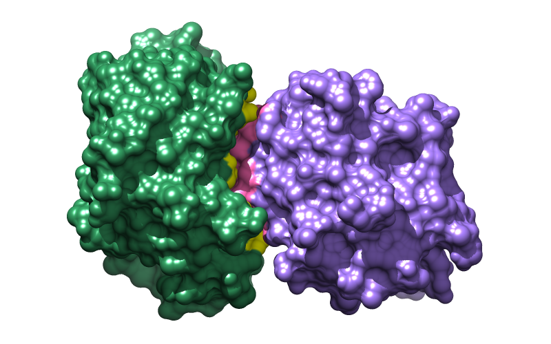 Command: color hot pink #0.2@/buriedSESArea>1The total buried area and details of the calculation are given in the Reply Log. Different cutoff values could be used, but in this case, atoms with > 1.0 Å2 of solvent-excluded surface area buried in the interface are similar to the set of atoms found in the method 1 example. Although solvent, ions, and ligands are not enclosed in the displayed surfaces, the buried-area calculation will include all specified atoms. Thus it is important to specify only the intended atoms; for example, if nonprotein atoms were present: