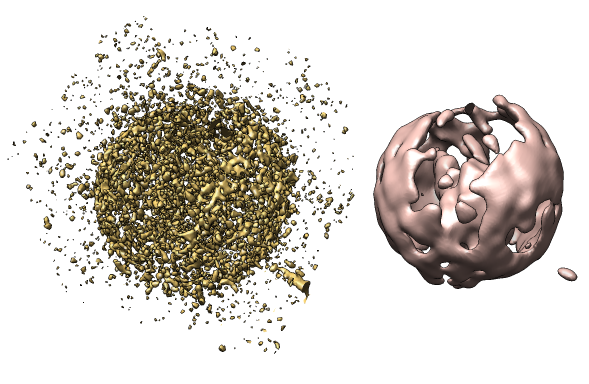 This tool smooths volume data by performing a convolution with a Gaussian of user-specified width. This improves signal to noise but reduces resolution. It acts on the volume set currently displayed in the volume viewer dialog. It produces a new volume data set that is shown with volume viewer and hides the original data set.