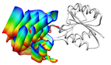 Given two protein conformations or an ID from the Database of Macromolecular Movements, the server generates a ViewMotions rainbow image and corresponding Chimera session. The conformational change is shown as a series of interpolated structures with variable regions rainbow-colored from blue to red. The server is described in Cockrell and Kantrowitz, J Mol Graph Model 40:48 (2013). |