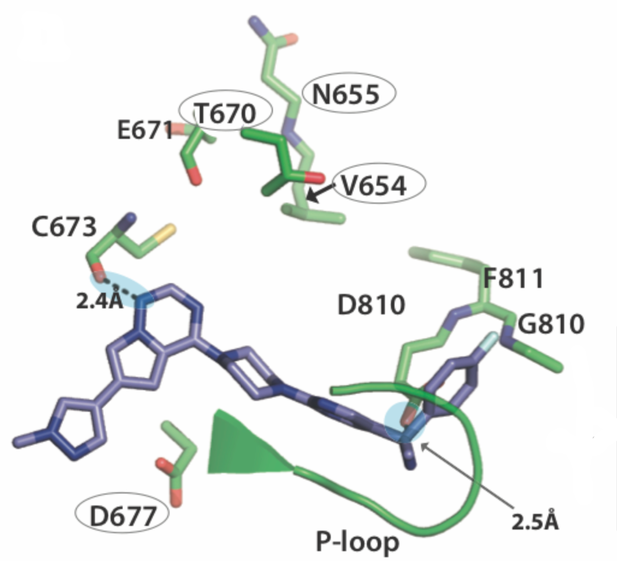 KIT mutations in circles inhibit drug avapritinib (blue) although through an indirect interaction that moves P-loop (green ribbon) which blocks binding.
