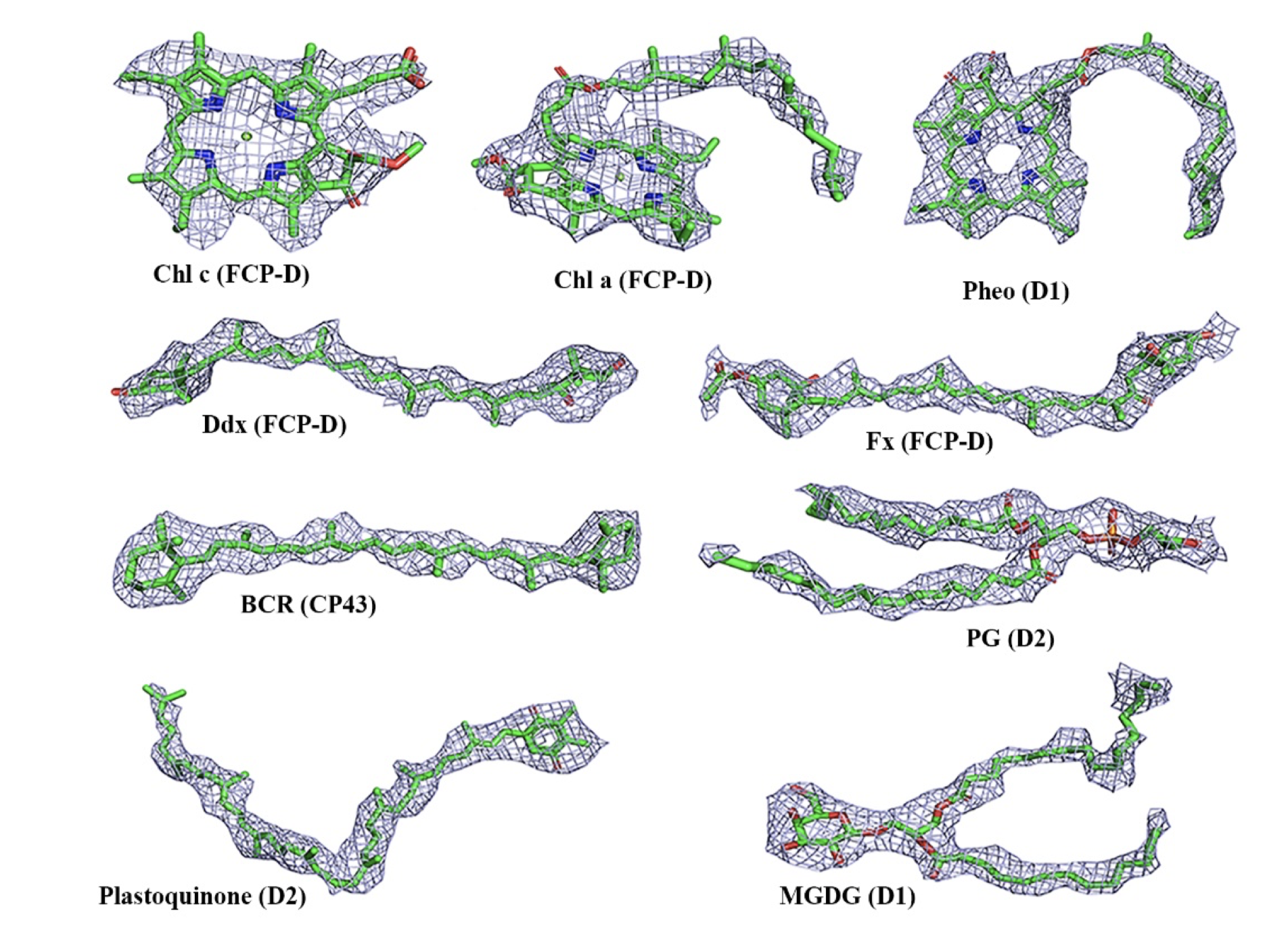 Chlorophyll and other ligands showing cryoEM density at ~3 Angstrom resolution.