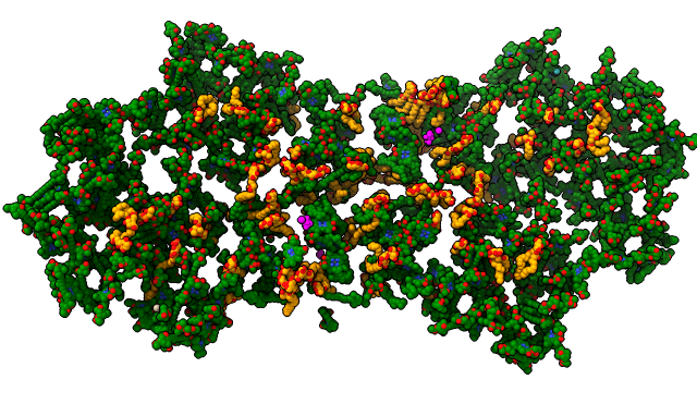 Ligands with proteins hidden: chlorophyll and fucoxanthin pigment (green), lipids (orange), ion-like (magenta).