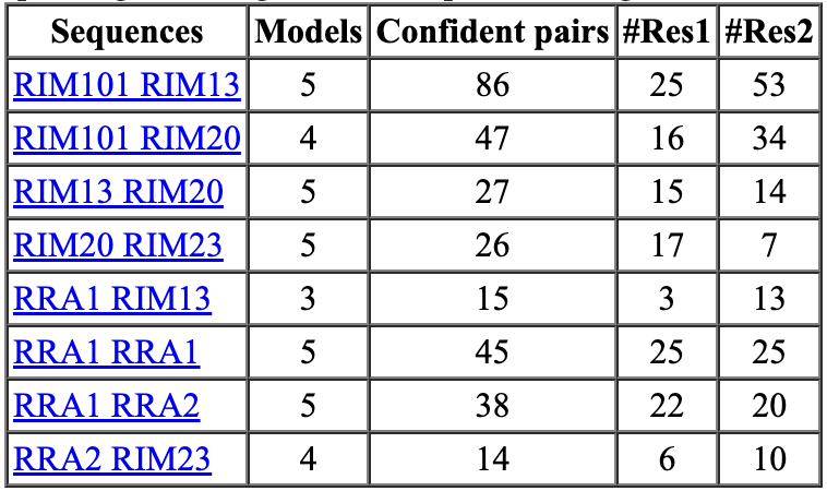 Run these predictions using the rim_dimers.fasta file from a Linux shell producing log.txt and many files rim_dimers.zip (500 MB, list) including 5 structures for each dimer.