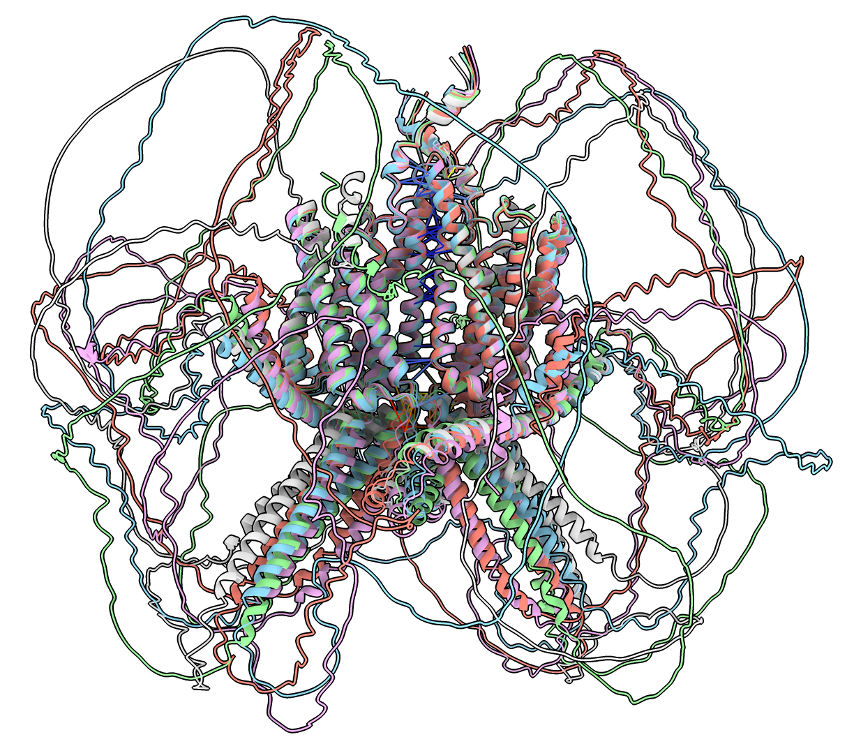 5 models superimposed only pLDDT > 50 shown. Command: hide @@bfactor<50 ribbon |