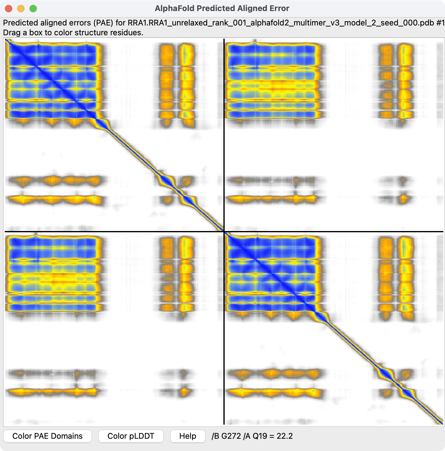 Dragging box around off diagonal blue/yellow square in PAE heatmap colors the two domains having confident relative orientation. |