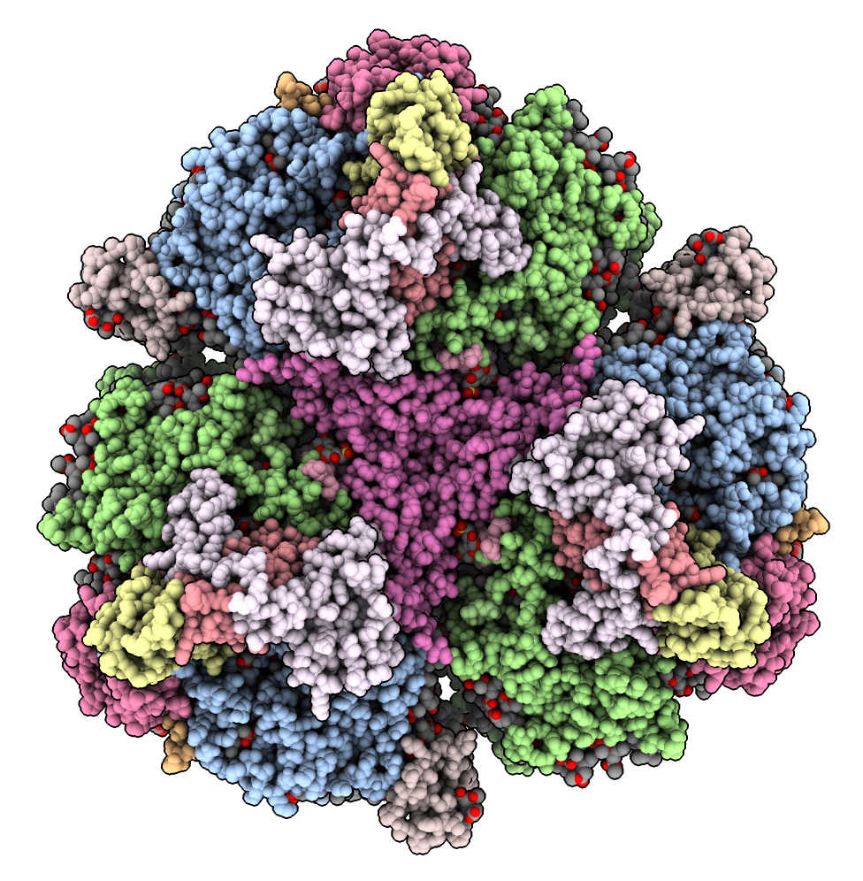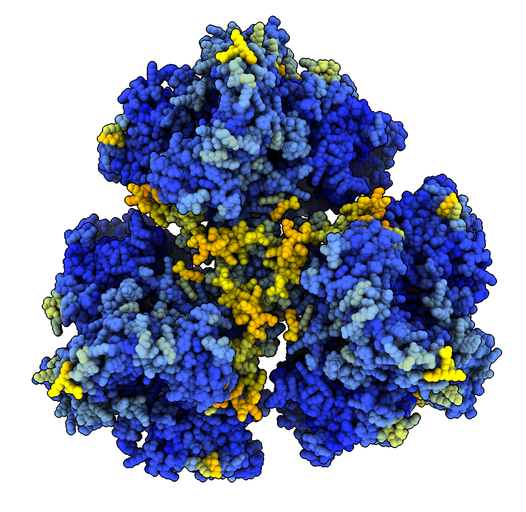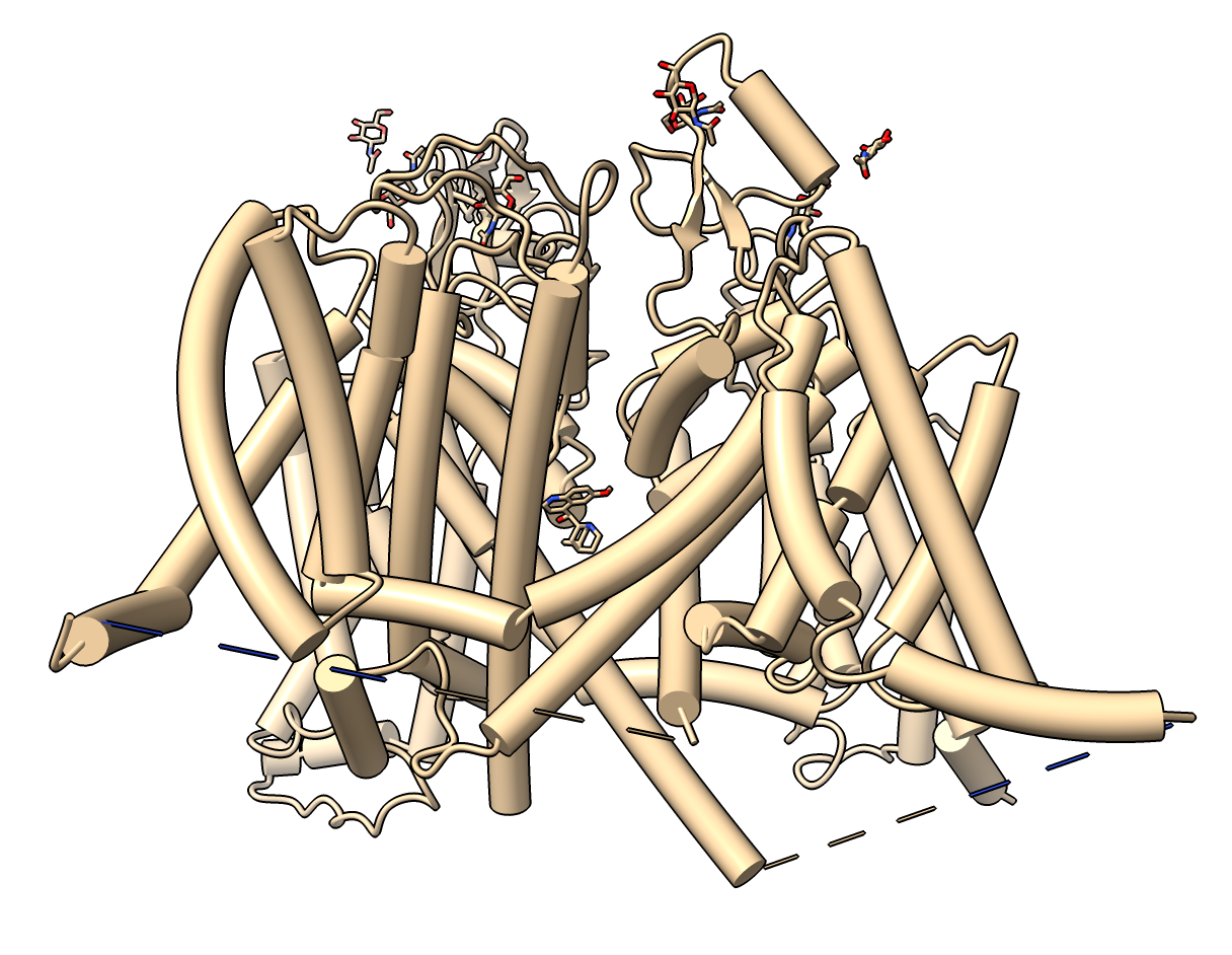 Trimeric photosystem I complex from cyanobacterium, PDB 6VPV. AlphaFold database homology models for 7 of the 11 unique proteins are found from rice, maize, arabidopsis, soybean all with less than 1 Angstrom C-alpha RMSD difference to the experimental structure. Some homologs have much shorter sequences than the experimental structure.