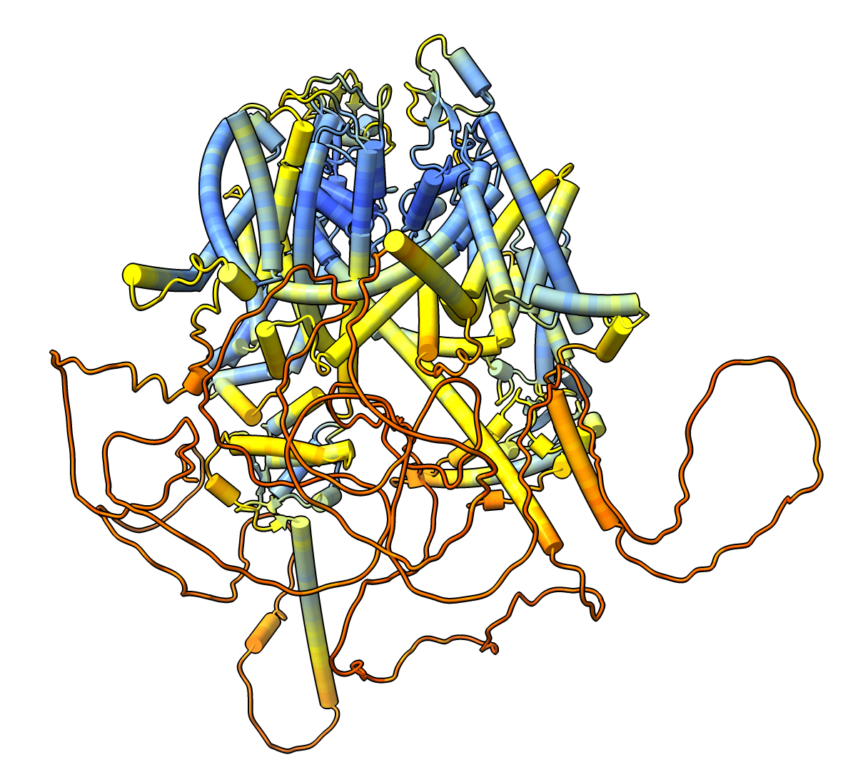 Assemblies not predicted. The AlphaFold algorithm does not predict structures of multi-protein complexes, only single proteins. Ligands and ions are not predicted.