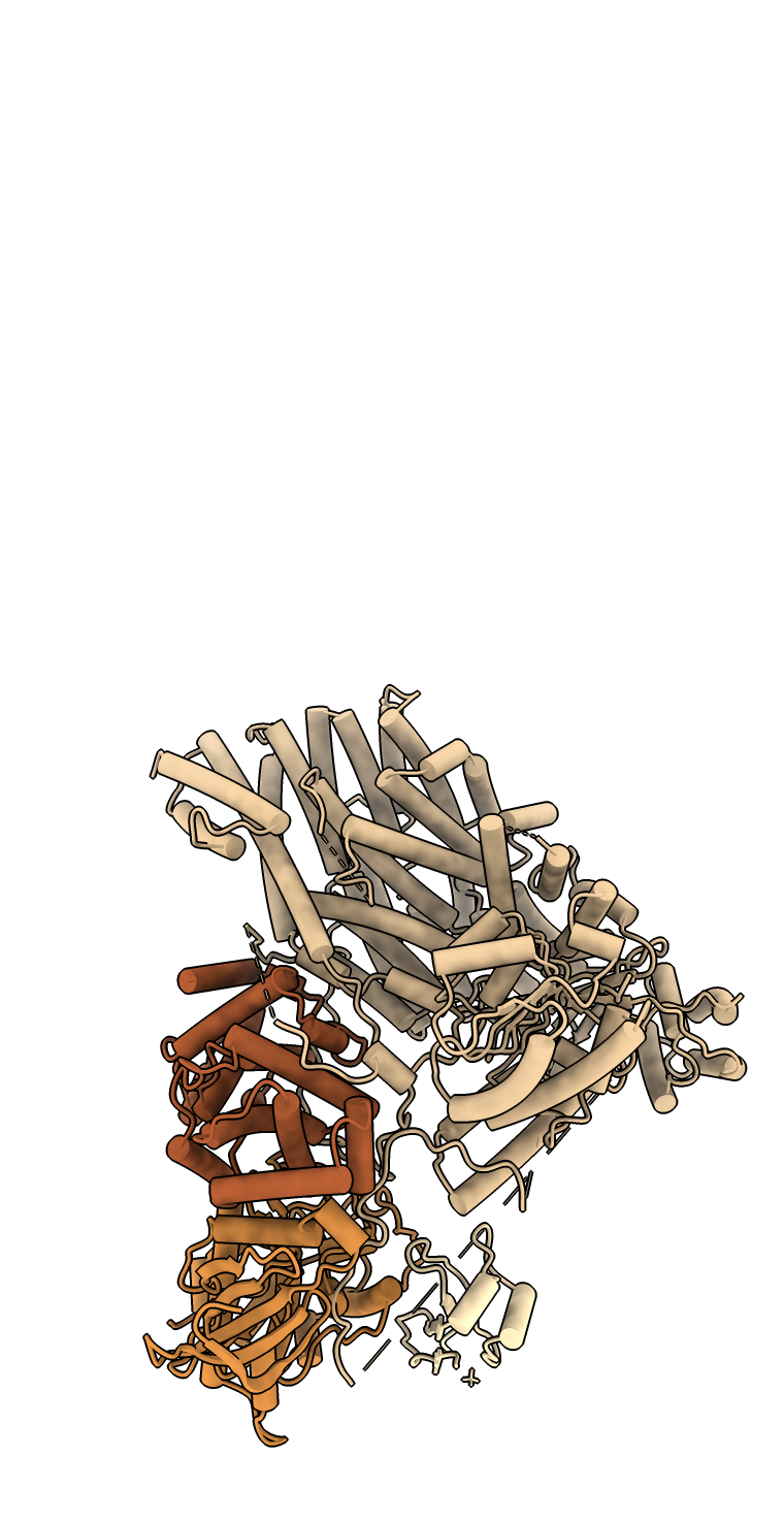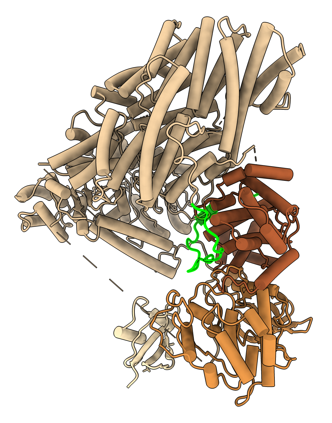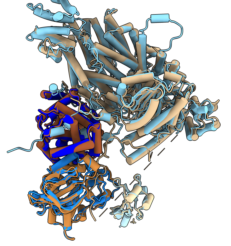 Four protein complex composed of separase-securin fusion, CDK1, cyclin B1, CKS1, PDB entry 7NJ0. Separase releases chromosome pairs during mitosis and is inhibited by cylcin proteins. AlphaFold predictions of these four proteins in isolation mostly agree with electron microscopy except at interfaces. ChimeraX commands to fetch the PDB and AlphaFold models and show helices as cylindersopen 7nj0 alphafold match #1 preset cylinder |