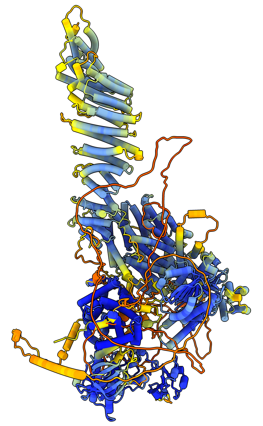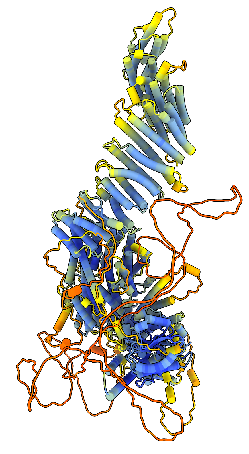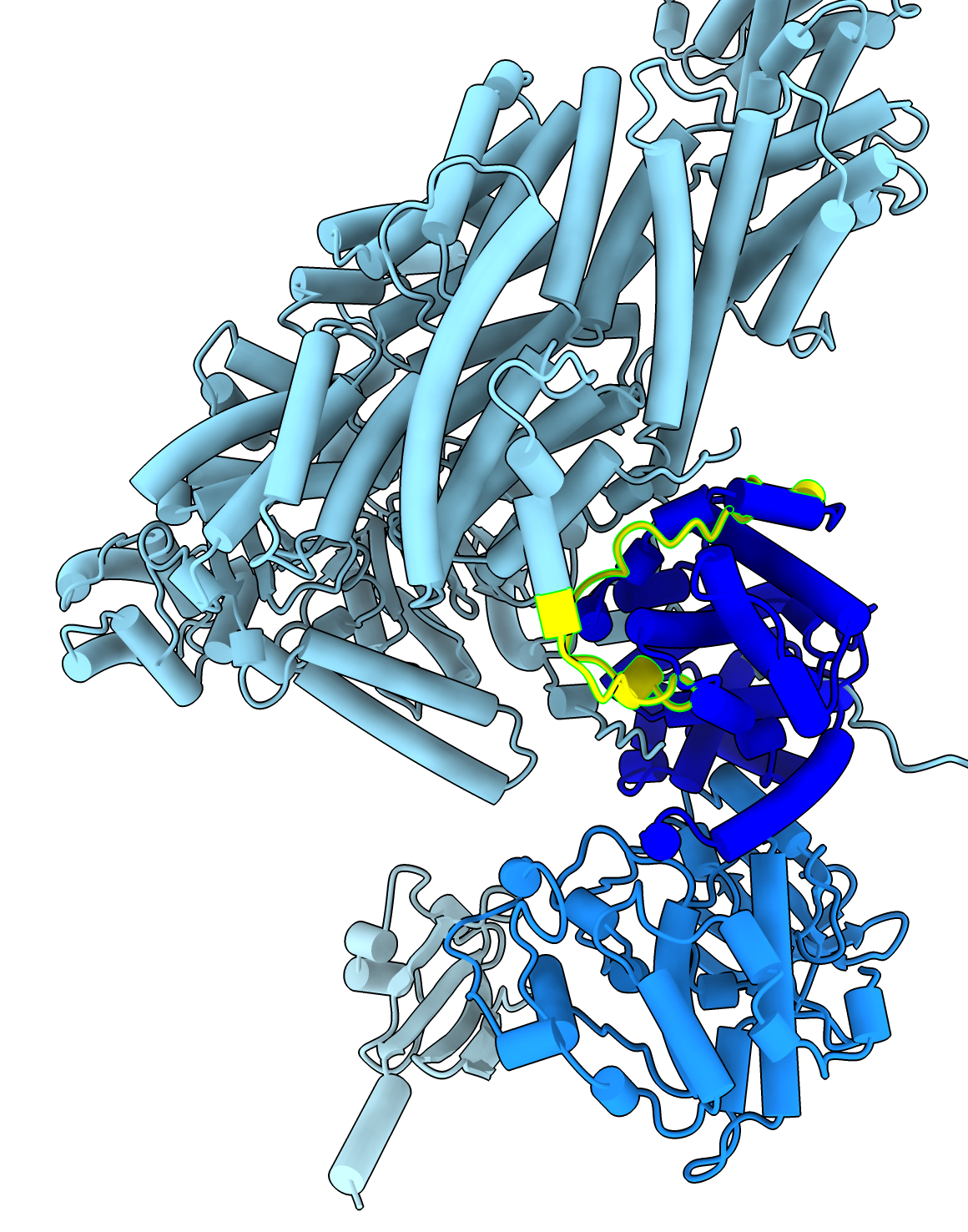Two protein complex of separase and securin, PDB entry 7NJ1, where securin is intertwined with separase. Separase releases chromosome pairs during mitosis and is inhibited by securin. AlphaFold predictions of these two proteins in isolation do not get the right conformation since protein-protein interactions strongly effect the securin conformation.