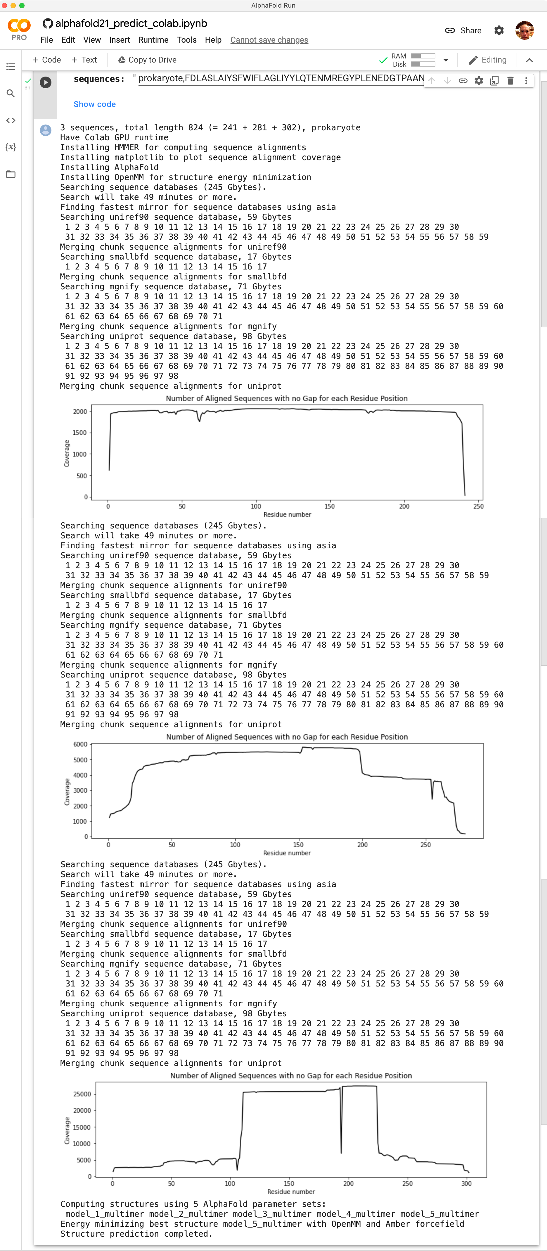 The AlphaFold Run panel is a web browser log of the output from Google Colab. It will show progress as each of the the 3 sequences is searched against databases of hundreds of millions of sequences and will show graphs of how deep the multiple sequence alignment is for each at each amino acid position. Sequence depths less than 100 can lead to poor predictions.