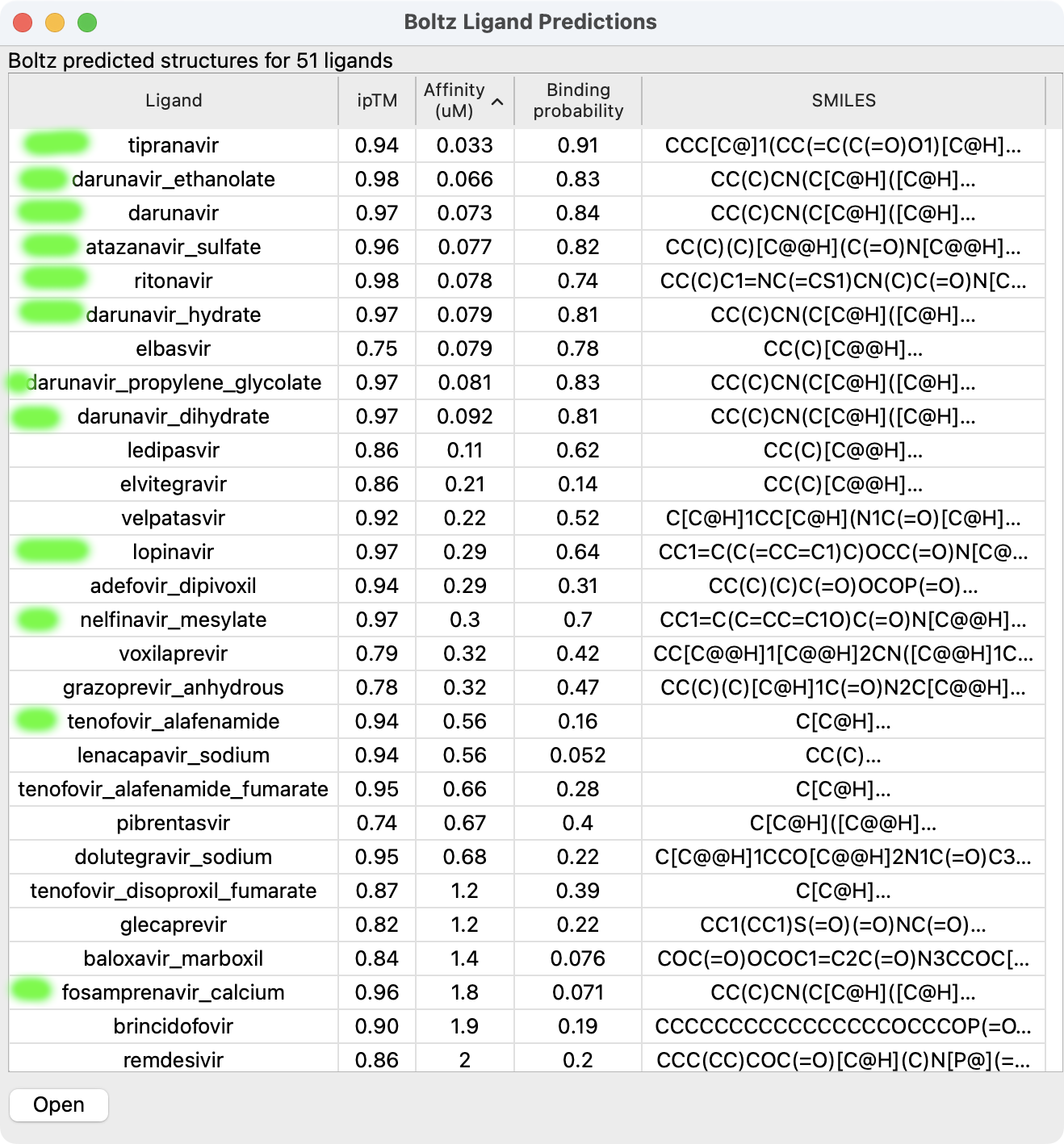 Progress messages will appear in the Boltz panel as the structures are predicted for each ligand. After all structures are predicted the binding affinity is predicted. About half of the time is taken to predict affinity and if you don't want affinity scores you can set "Predict ligand binding affinity: none" under Options to speed up the calculation. When the predictions complete a table of results giving ligand name, ipTM, affinity, binding probability, and SMILES string will appear. The table can be sorted by clicking on the column headers. Selecting rows of the table and pressing the Open button will open the selected structure predictions. The table is written as comma-separated values to the directory where Boltz was run, for example hiv_protease/hiv_protease.bzlig in the case shown. This file will appear in the file history thumbnails when you start ChimeraX in future sessions and clicking on the thumbnail will reshow the table.