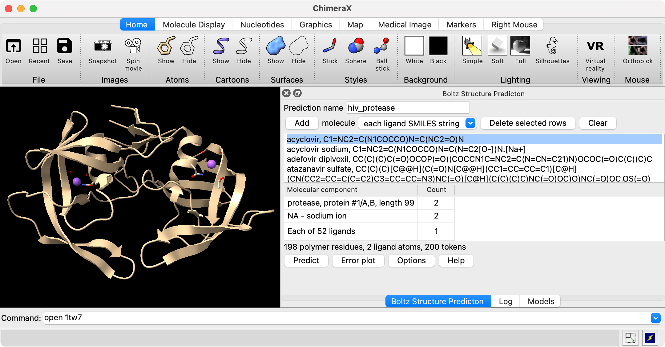 ChimeraX can run the Boltz structure prediction method to compute atomic structures of proteins and nucleic acids, including modified residues, ligands, ions and solvent on your laptop or desktop computer. ChimeraX daily builds dated July 22, 2025 and newer use Boltz 2.1.1 and include ligand affinity prediction. ChimeraX 1.10 released June 26, 2025 uses Boltz 1.0.0. See the demonstration video or affinity prediction video or batch ligands video. The method is inspired by AlphaFold 3 and described in the following preprint and is fully open source with a very permissive MIT license.