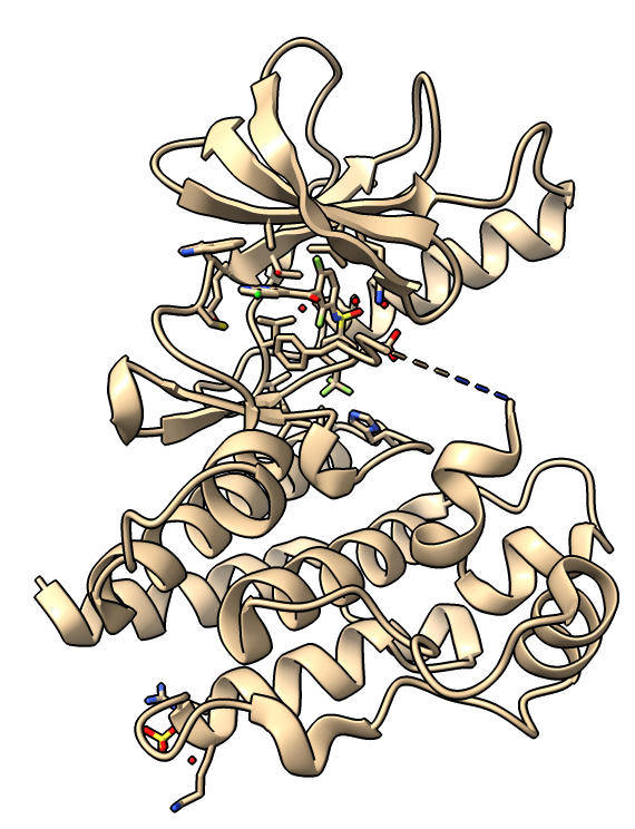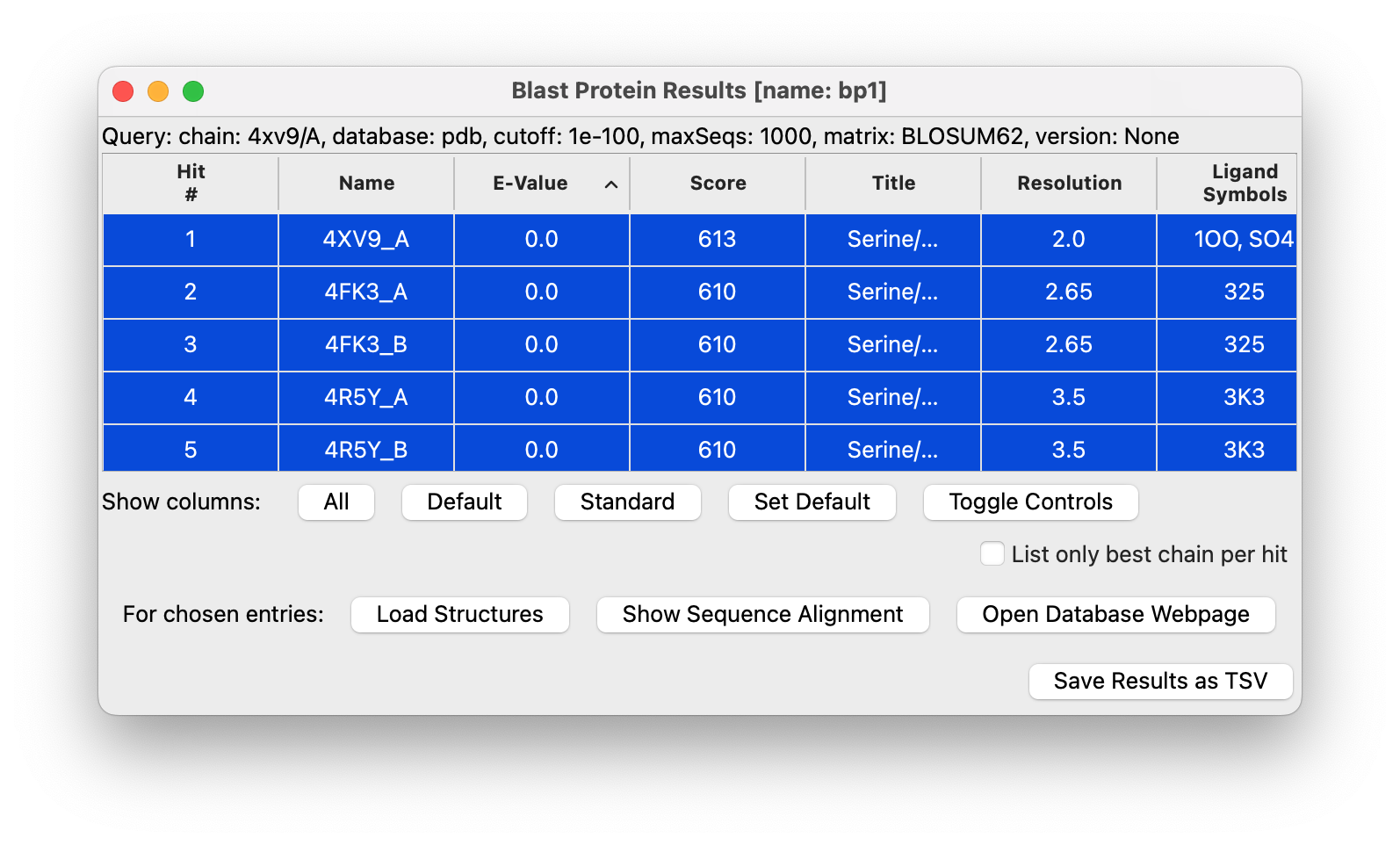 We will use a B-Raf kinase structure PDB 4xv9 to search for other PDB B-Raf structures with very similar sequences using BLAST sequence search and an e-value cutoff of 1e-100. This finds structures with sequences that are at least 90% identical.