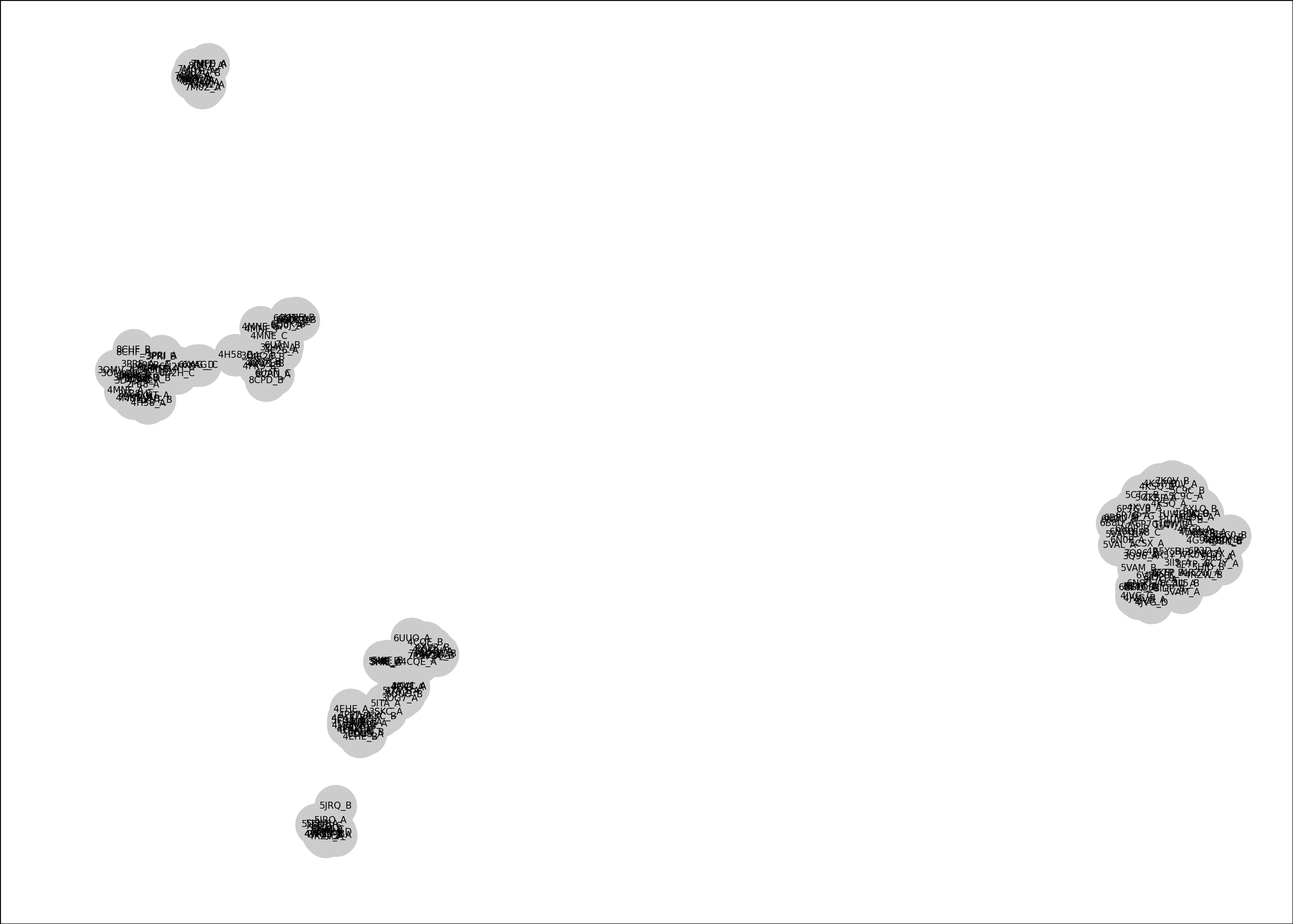 A plot is shown with 172 gray circles with PDB and chain names for each, but the text is not readable because they are overlapped. Scroll in the plot to zoom, and use middle mouse button or Alt-drag to translate. To allow the plot to be bigger you can drag it using its title-bar out of the main ChimeraX window, or drop it on top of the log panel. I find it useful to stack the Log, Models, Sequence Alignment and Plot windows on top of each other.