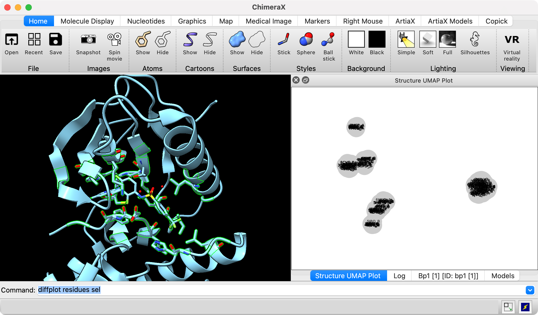Here is how to cluster tens or hundreds of protein structures according to differences in backbone conformation using ChimeraX. This uses a new ChimeraX command diffplot available in ChimeraX daily builds dated April 24, 2024 and newer. The method looks at the x,y,z coordinates of some chosen residues for each of the structures and projects all those x,y,z values treated as a single high dimensional vector down to two dimensions using the UMAP (uniform manifold approximation and projection) algorithm.