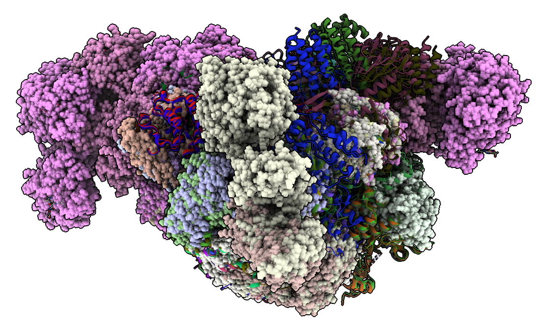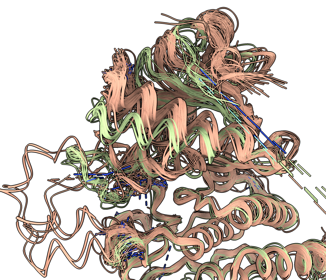 Note that in some places the colored ribbons follow separate paths. An important activation helix takes different paths in pink, light green and dark green clusters. The different colored ribbons also take different paths in other parts of the protein.